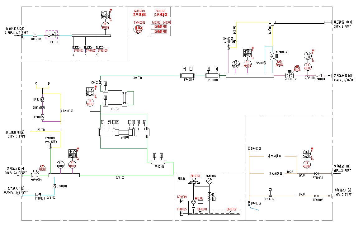 客户原方案使用1200及本体扩展模块,替代方案为1200+MR30分布式IO,成本降幅为45%;开关量输入模块主要用于连接按钮、加压机运行及故障信号、阀门开到位及关到位信号;开关量输出主要用于控制指示灯、电磁阀开关、压缩泵启停;模拟量输入模块主要用于采集罐体压力、管道压力、压缩机出入口压力及温度、电机温度等。