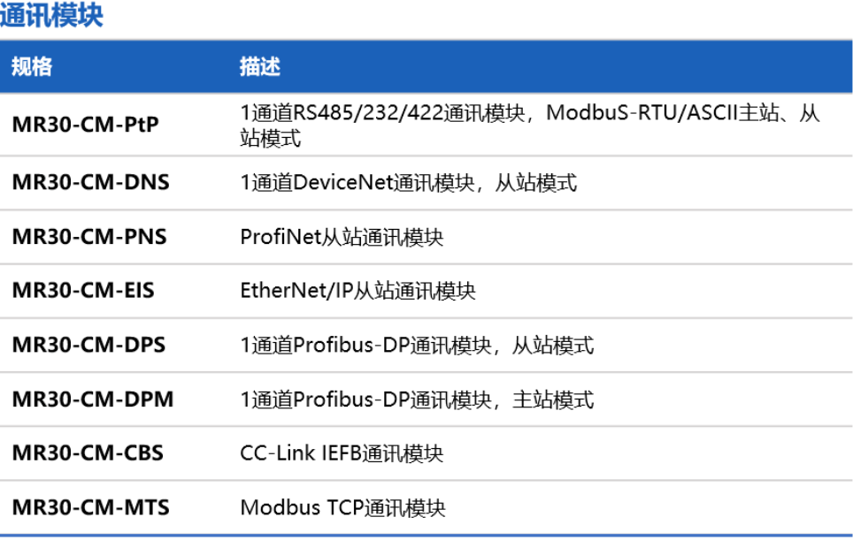 明达技术MR30系列提供丰富的耦合器选项,根据总线协议的不同,分为PROFINET耦合器、EtherCAT耦合器、EtherNET/IP耦合器、Modbus TCP耦合器、CC-Link IEFB耦合器。