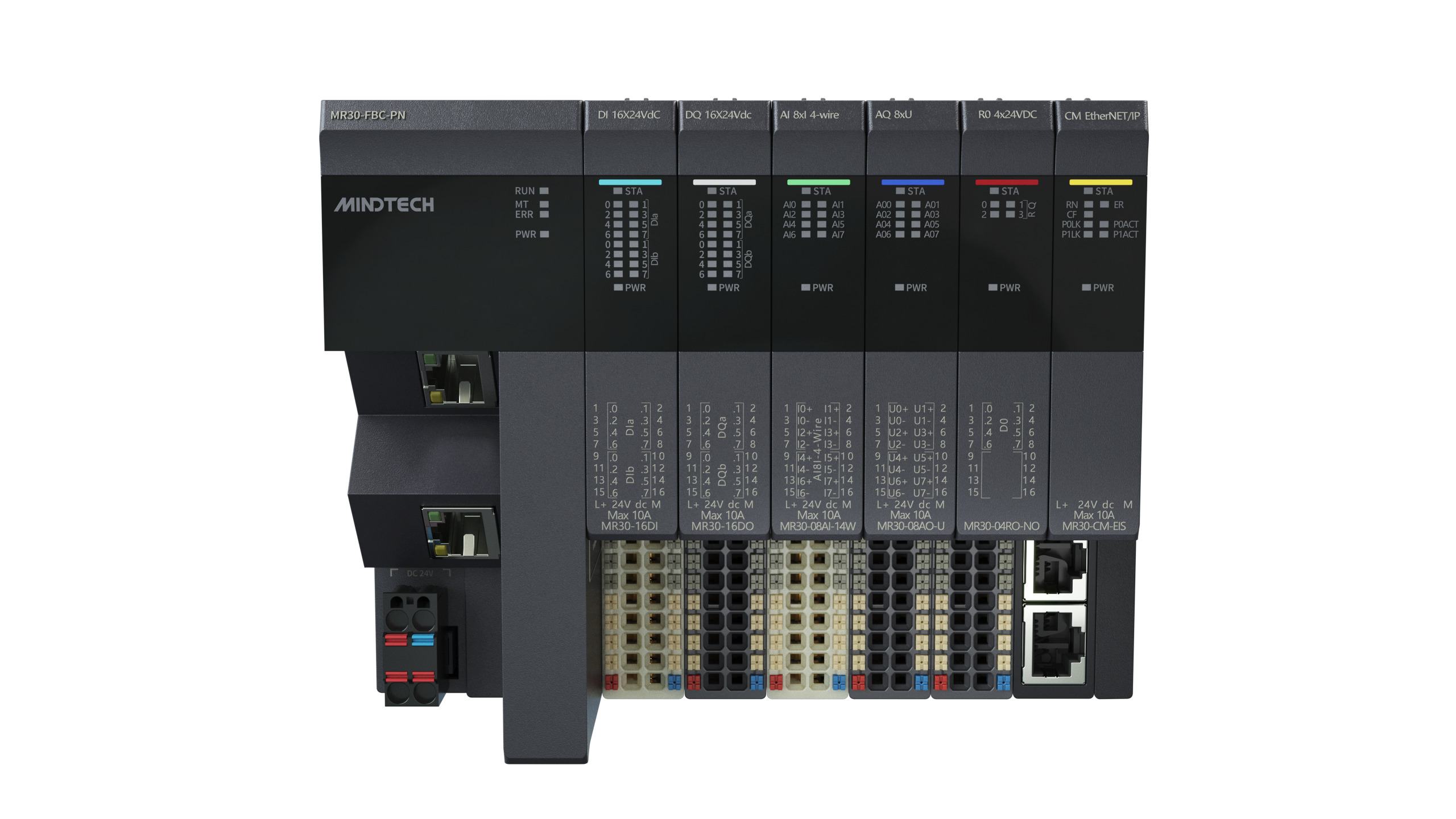 MR30耦合器最多可以连接31个I/O模块,支持主流开放协议,包括ProfiNet、EtherNet/IP、EtherCat、ModbusTCP、CC-Link IE Field Basic,可连接到不同品牌的PLC和工业控制器。
