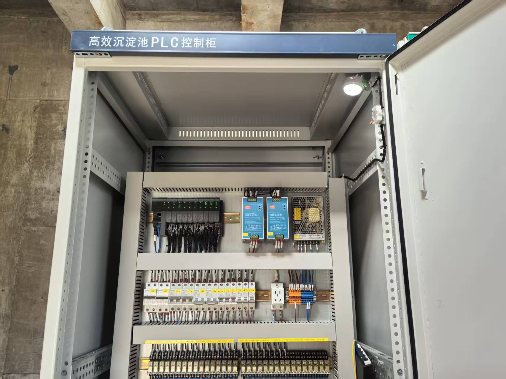 高效沉淀池:该工艺同样使用一块MR30-FBC-PN模块,挂载MR30-16DI,MR30-16DO,MR30-08AI-I4W(8路模拟量输入),MR30-08AO-I(8路模拟量输出)模块,实现对生化池中的潜水搅拌器、内外回流泵、剩余污泥泵,以及对沉淀池的刮泥机、回流泵等设备的启停控制,其中剩余污泥泵需要根据脱泥间的需求控制频率大小,所以采用变频控制,本站采用MR30-08AI-I4W模块采集变频器的电流信号,再通过MR30-08AO-I模块输出4-20mA控制变频器频率实现控制。