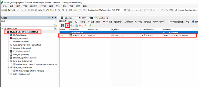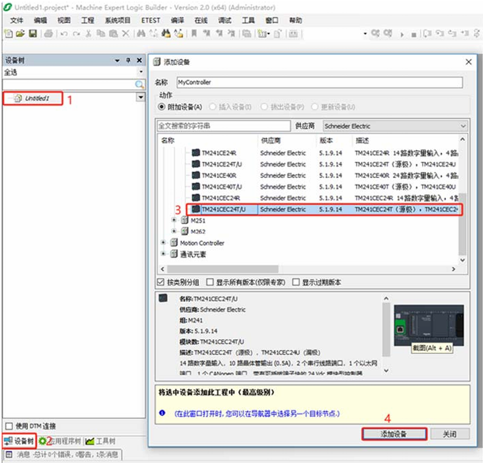 点Untited1,点击设备树,在Logic Controller→M241→TM241CEC24T/U 目录下选择CPU后,点击添加设备并关闭对应框。
