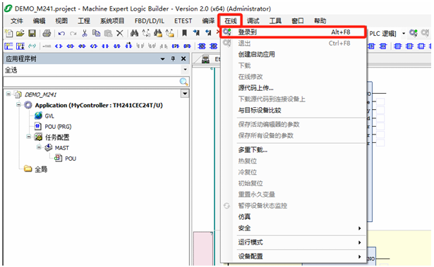 点击菜单栏中的在线,在下拉菜单中点击登录到