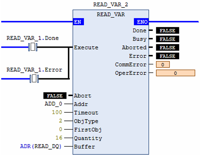 READ_VAR_2.Done 和 READ_VAR_2.Error:为 READ_VAR 功能块的完成和错误信号,用于触发本功能块,并与其它功能块形成轮循;