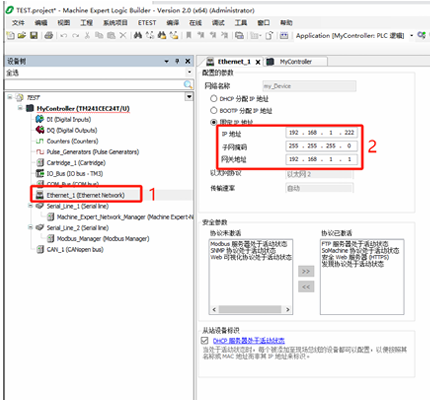 双击设备树中的Ethernet_1(Ethernet Network),在右侧配置的参数中设置IP 地址,子网掩码及网关地址等参数,如下图所示。