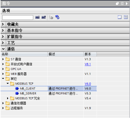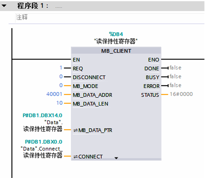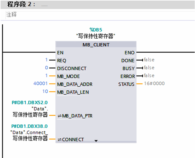 打开OB1,在指令栏找到MB_Client指令并拖入程序段1用于读保持性寄存器,将MB_Client指令并拖入程序段2用于写保持性寄存器,相关管脚参数如下图所示。