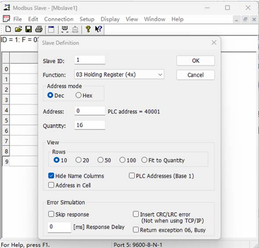 我们在第一个串口Port1下增加一个站点Node,并在此站点下增加读保持性寄存器命令和写保持性寄存器命令,读写数量均为10,截图如下所示。