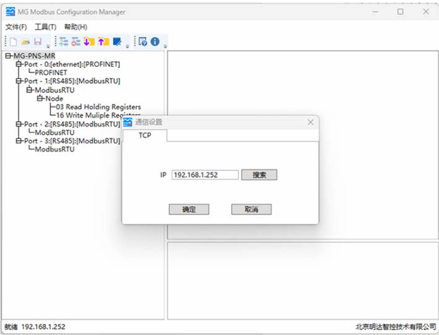 点击工具→通信测试,在弹出的对话框中输入协议转换器 IP 地址后点击搜索,在弹出的设置发现对话框中点击搜索,双击搜索到的设备即回到下图界面,表示设备已经进行连接,点击确定表示连接完成。