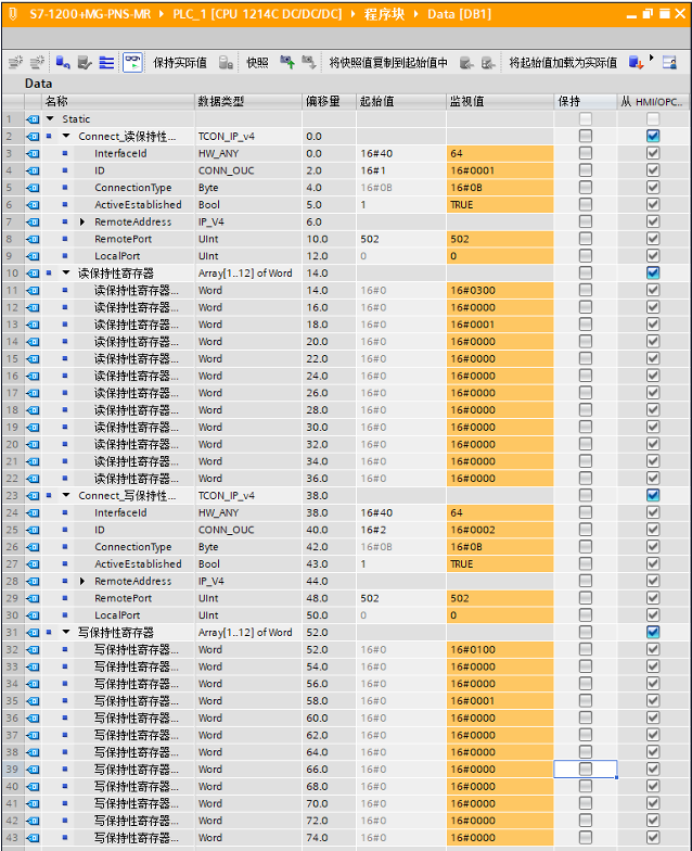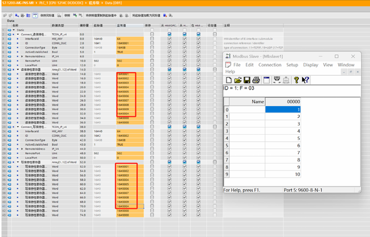 将程序下载至CPU,点击数据通讯数据块,通过写入数值来查看读取的数值是否一致,测试结果如下图所示,表明通讯测试正常。
