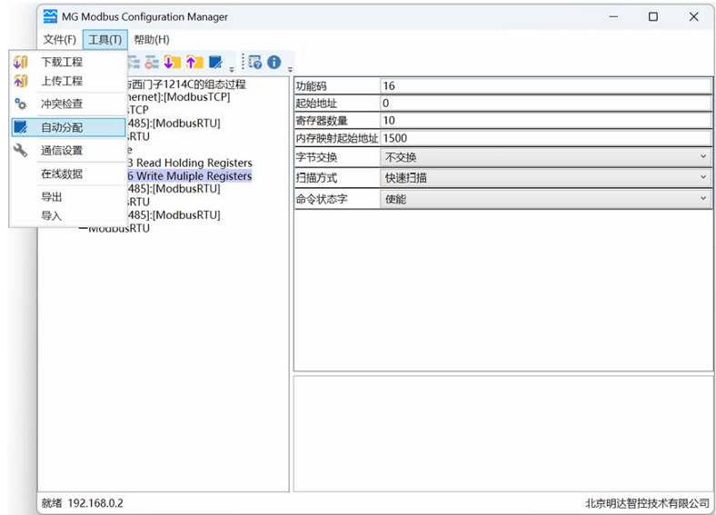 以上读写命令中的内存映射起始地址可自行分配,也可自动分配,自动分配过程映像能够保证分配的正确性,且能保证更合理的利用过程映像区。点击工具,自动分配,点击弹出的提示框中的是。