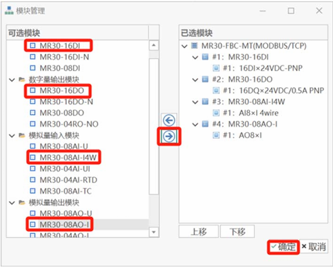 3) 右键耦合器,选择模块管理,依次将MR30-16DI、MR30-16DO、MR30-08A1-14W、MR30-08AO-I 添加至右侧已选模块后点击确定,如下图所示。