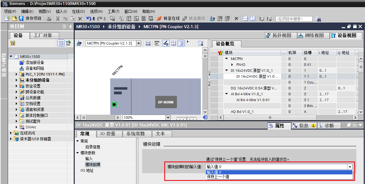 8、所有IO模块诊断中均包含:电源电压L+缺失,开关量输入模块每个通道均可按需设置滤波,也可以设置当模块故障时的输入值:输入值0或保持上一个值,如下两图所示